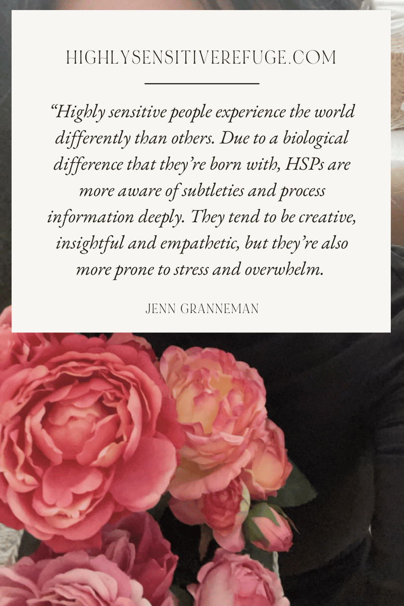 Jenn Grenneman of Highly Sensitive Refuge articulates really beautifully with one of my favorite quotes on sensitivity: "Highly Sensitive People experience the world differently than others. Due to a biological difference that they're born with, HSPs are more aware of subtleties and process information deeply. They tend to be creative, insightful and empathetic, but they're also more prone to stress and overwhelm."